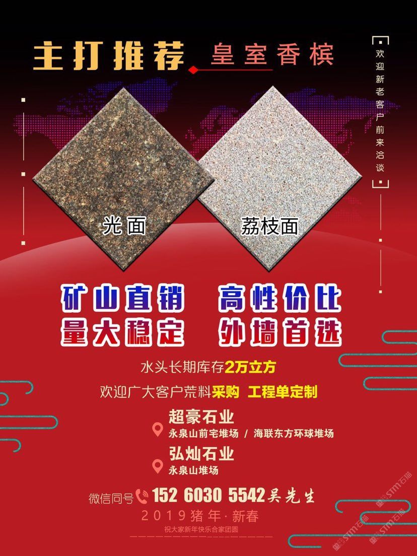 本公司自有工廠,專業(yè)承接各種國內(nèi)外工程,別墅,酒店,大理石花崗巖異性線條訂單! ????強(qiáng)力推薦,礦山直銷《皇室香檳》量大穩(wěn)定,石料方正、底色均勻、石材缺陷少。工程????長期庫存荒料2萬方,各類樣品已備好????歡迎來電咨詢 為有建筑幕墻(酒店、公寓、商務(wù)大廈、寫字樓,別墅等)工程項目的朋友,提供優(yōu)質(zhì)的石材資源。 誠信經(jīng)營、合作共贏、服務(wù)至上、期待與您共同發(fā)展! 財富熱線:15260305542 吳 ?? ?? ??