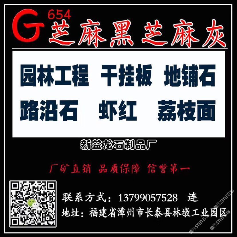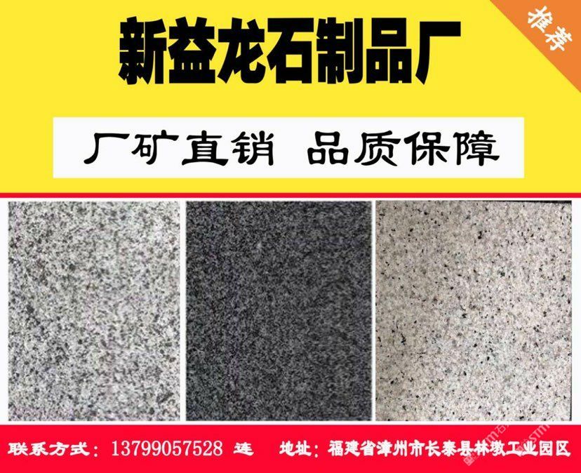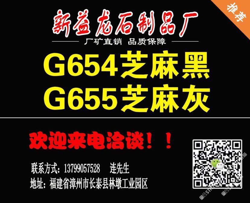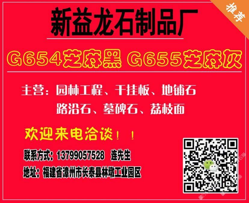 佳盈石業(yè)石制品廠位于“中國石材g654石材生產(chǎn)基地”——福建省漳州市長泰縣林墩工業(yè)區(qū)江都村。本廠集礦山開采, 石材加工,工程訂單及進出口貿(mào)易于一體;擁有成套先進的石材設(shè)備,掌握先進的石材加工技術(shù),嚴格 控制每道生產(chǎn)工序,努力做到以的生產(chǎn)成本生產(chǎn)出能夠讓客戶滿意的產(chǎn)品,且供貨及時,價格優(yōu)惠 ,能承接大數(shù)量的定單。經(jīng)過幾年發(fā)展,本廠擁有g(shù)654礦山,專業(yè)生產(chǎn)、加工國內(nèi)外花崗巖板材。 主營:芝麻黑g654 兼營:芝麻灰g655、芝麻白g623、灰麻g688、黃銹石g682等花崗巖品種板材及各種異形;加工方式多樣化:磨光板、毛板、厚板 、薄板、規(guī)格板、火燒板、地鋪石、小方塊、自然板、拉絲板、洗衣板、染板、菠蘿面、機切板、大板 、荔枝面、路沿石、臺面板、拋光板、線條、盲人石、滾石及各種建筑工程配套用石的生產(chǎn)、加工和銷 售。產(chǎn)品不僅暢銷國內(nèi)各大城市,還遠銷到美國,加拿大,英國,韓國,香港,臺灣等國家和地區(qū)。 新益龍石業(yè)以“質(zhì)量為本、服務(wù)至上、信譽,客戶”為經(jīng)營理念,真誠期待著與您合作,攜手共 創(chuàng)雙贏,共享石材業(yè)輝煌明天。竭誠歡迎國內(nèi)外廣大朋友來人來函洽談業(yè)務(wù),相互合作,共同發(fā)展! 洽談熱線:13799057528(連)