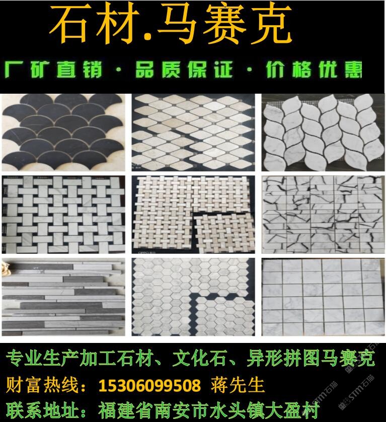 廈門摩恩石材馬賽克工廠是生產(chǎn)馬賽克、大理石、拼花、石線等石材的專業(yè)工廠,工廠成立15年誠信合作,價格公道,以質(zhì)量求生存,歡迎來廠參觀、詢價、考察下單。我們的工廠負責人蔣先生隨時恭候您的光臨,電話:15306099508,微信:15306099508 qq:1043118173