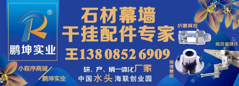 福建鵬坤實業(yè)有限公司是一家集研、產(chǎn)、銷及服務(wù)為一體的現(xiàn)代化高新技術(shù)企業(yè),公司注冊資金伍仟萬圓整。 產(chǎn)品涵括石材金屬配件全鏈條:背栓、錨栓、鋁合金掛件、不銹鋼掛件、龍骨系統(tǒng)、預(yù)埋件、拓孔設(shè)備及服務(wù)、鋁合金加強筋、預(yù)埋螺母、光伏支架等。 ???提供系統(tǒng)性干掛服務(wù):保溫復合板干掛系統(tǒng)、鋁蜂窩干掛系統(tǒng)、瓷磚復合板干掛系統(tǒng)、線條干掛系統(tǒng)、背景墻干掛系統(tǒng)等。