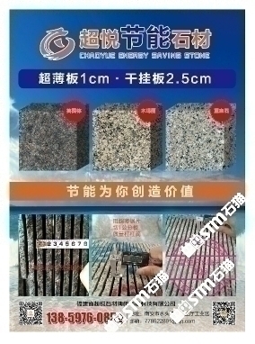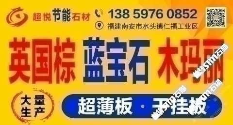 發(fā)布信息: 木瑪麗/藍(lán)寶石/英國棕(超薄板)吳總 13859760852手機微信同號-福建超悅石材薄板科技有限公司是一家專注于生產(chǎn)、研發(fā)花崗巖超薄板的研發(fā)型企業(yè),秉承“用創(chuàng)新的芯、做超薄的板、走節(jié)能的路”的發(fā)展理念,在多年來堅持不懈的努力下,成功地研發(fā)了擁有環(huán)保性能及高新技術(shù)的超薄板,其優(yōu)點可與國際薄板加工技術(shù)媲美。 花崗巖超薄板被廣泛應(yīng)用于復(fù)合板領(lǐng)域,包括保溫材料和鋁蜂窩等,是建筑外墻裝飾材料的。該產(chǎn)品降低了建筑成本、節(jié)約了裝飾 材料,縮短了施工周期,是當(dāng)今社會廣為提倡和國家大力推廣的綠色、環(huán)保、節(jié)能建筑裝飾材料。 公司堅持奉行“創(chuàng)新永不止步,品質(zhì)始終如一”的經(jīng)營理念,爭創(chuàng)花崗巖超薄板領(lǐng)導(dǎo)品牌,將花崗巖超薄板做專做精做廣做強。