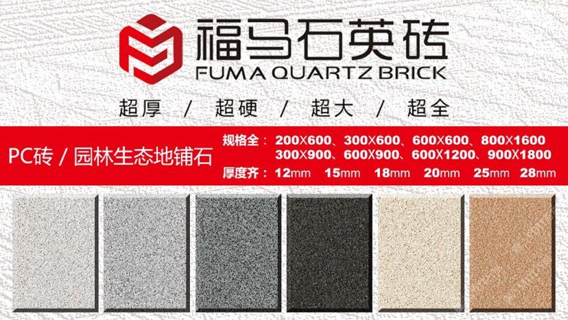 發(fā)布信息: ??福馬石英磚 ? 生態(tài)地鋪石創(chuàng)意源自于天然石材,品質(zhì)勝于天然石材。 以天然石粉、高嶺土、石英砂、長(zhǎng)石等原料,經(jīng)研磨、混合制漿、干燥噴粉、壓制、多層施釉、燒結(jié),1250℃高溫使原材料產(chǎn)生熔融狀態(tài),冷卻后重組結(jié)晶。這使得生態(tài)石更加密實(shí)和堅(jiān)硬。 ? 1、全瓷化通體材質(zhì),高瓷化度,低吸水率,使產(chǎn)品防滑、耐磨、高抗折、高耐污,清潔方便性。 ? 2、依據(jù)天然石材的表面,開具特殊模具表面,使生態(tài)地鋪石具有石材質(zhì)感,仿真度更高,更防滑,不同于普通廣場(chǎng)磚 ? 3、產(chǎn)品表面經(jīng)7道以上特殊釉水工藝處理,使產(chǎn)品具有耐磨、防滑,高耐污,清潔方便的特點(diǎn)。 ? 4、產(chǎn)品顏色豐富(量大可定制),尺寸多樣。能夠配合設(shè)計(jì)師獨(dú)特創(chuàng)意,實(shí)現(xiàn)不同環(huán)境和個(gè)性所要求的裝飾風(fēng)格。 ? 5、耐久性好,適合場(chǎng)所廣。產(chǎn)品具有耐磨抗壓、防滑耐污、耐酸堿、抗凍、不褪色的特點(diǎn)??捎糜诖笮拓涇嚳赏ㄐ械?,市政工程,小區(qū)景觀路面,休閑廣場(chǎng),園林綠化,公園公共停車場(chǎng)等。 ? 6、后期養(yǎng)護(hù)、修補(bǔ)簡(jiǎn)單。產(chǎn)品顏色可控,不同批次產(chǎn)品色差控制在95%左右,且常規(guī)顏色產(chǎn)品,長(zhǎng)期備有庫(kù)存。
