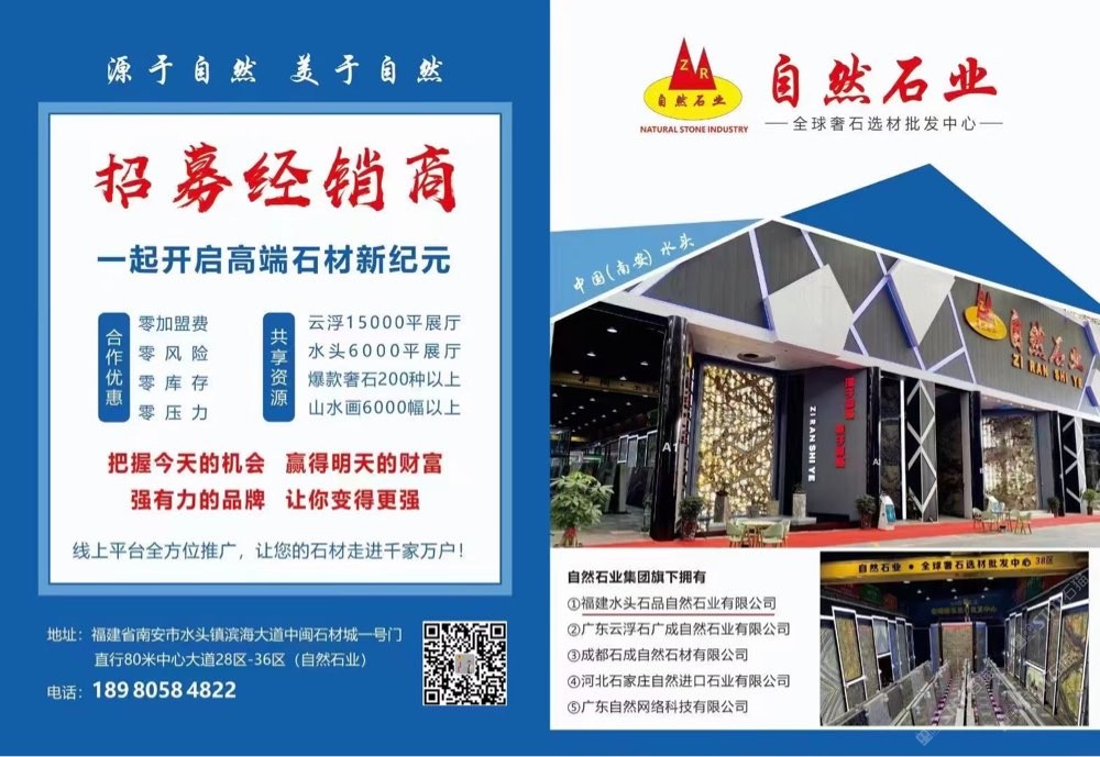 發(fā)布信息: 自然石業(yè)全球奢石批發(fā)中心,招募經(jīng)銷商,無需加盟費(fèi),一手貨源,專業(yè)背景墻供應(yīng)廠家。歡迎選購 ??19305059488(微信同號(hào)) 主營:潘多拉,新款潘多拉,藍(lán)絲綢,紅絲綢,絲綢之路,魅力人生,蒂芙尼,卡拉白,魚肚白,魚肚灰,盛世紅顏,紅寶石,石榴紅寶,桃李春風(fēng),金枝玉葉。金玉滿堂,金孔雀,孔雀開屏,火樹銀花,潘多拉,維也納,亞馬遜綠,綠翡翠,加雅綠,白色羅馬,藍(lán)色羅馬,羅馬印象,海納百川,春山畫境,冰河世紀(jì),波光靈動(dòng),金戈壁玉,天澤玉石,鉑金鉆,翰墨白金,景泰藍(lán),皇家藍(lán),白銀狐,雪山銀狐,雪山蘭,雪山藍(lán),雪山白,山水畫,煙影流香,藍(lán)水晶,紫水晶,加爾達(dá)之晶,龍文綠,竹節(jié)綠,綠斑竹,紫氣東來,千里馬,藍(lán)色精靈,壁山芳華,格蘭云天,香格里拉,夢幻藍(lán)寶,海洋之星,綠野仙蹤,藍(lán)翡翠,自然白,羅馬灰,白底潘多拉等產(chǎn)品!有單你來談,價(jià)格好商量! 中閩石材城28區(qū)-36區(qū)(一號(hào)門直走一百米左手邊)