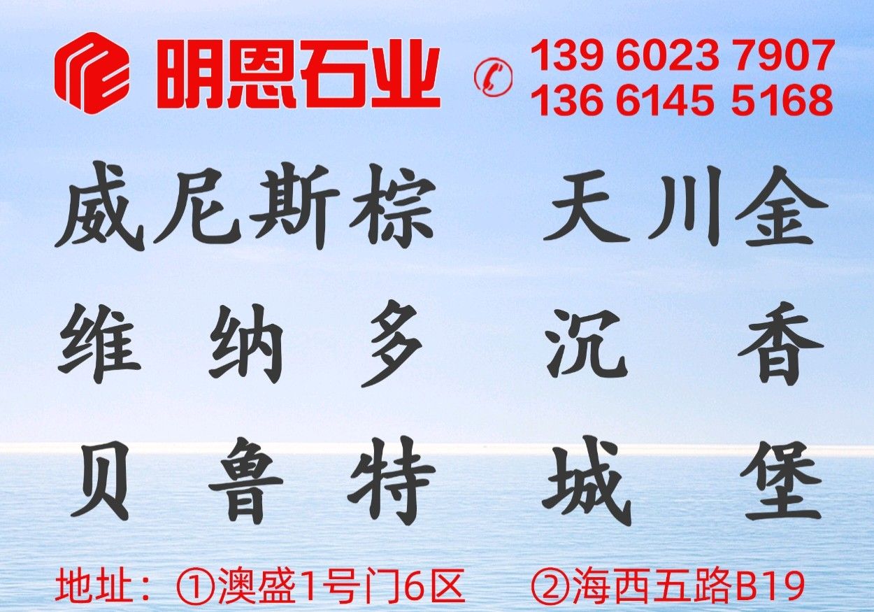 發(fā)布信息: 上海明恩石業(yè)是一家專業(yè)大理石批發(fā)和成品供應(yīng) 1:外墻系列:貝魯特(溫莎米黃),城堡米黃,沉香米黃,維納多~~荒料,各種厚度大板,成品供應(yīng)。 2:輕奢系列:威尼斯棕,威尼斯黑,范特西,意大利天川金 產(chǎn)品從國外荒料﹣光板﹣(承接)成品單,一條龍服務(wù)。公司秉承"信譽(yù)至上,量大,質(zhì)優(yōu),價廉"的原則,歡迎廣大新老客戶來我司參觀指導(dǎo)。