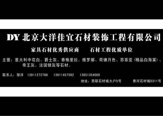 北京大洋佳宜石材裝飾有限公司 聯(lián)系人:鄒洋    139****2786 查看 010****8103 查看 主營范圍: 大板批發(fā)、異型加工、花崗巖加工、大理石加工、人造石加工、 企業(yè)地址:河北廊坊香河縣安平鎮(zhèn)香河石材城A0311